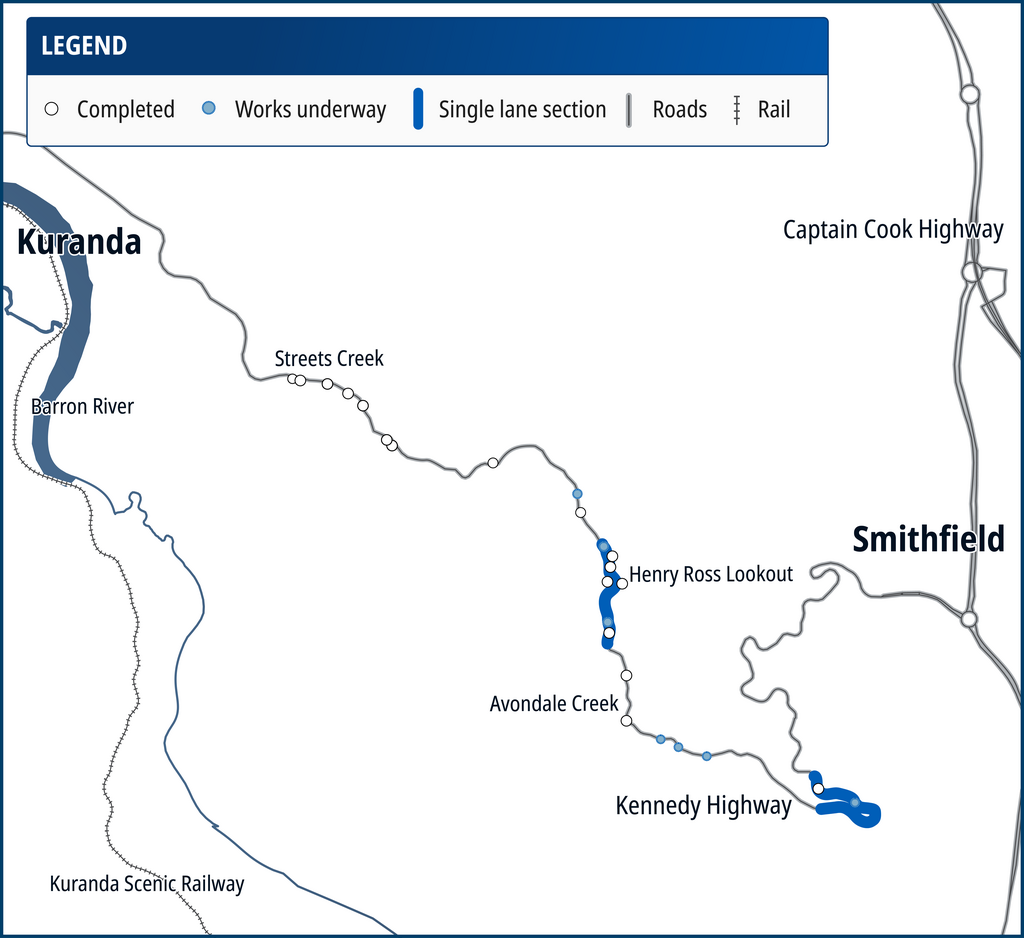 - Kuranda Range Road will have just one single lane traffic control area at Henry Ross Lookout for road user safety.