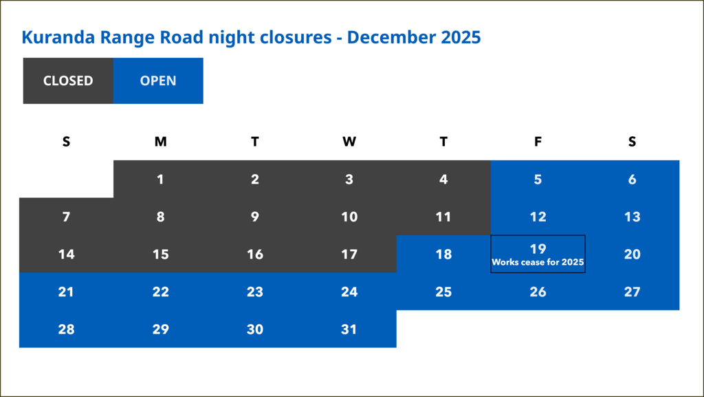 - The rest of Kuranda Range Road will have two-way traffic control temporarily reinstated at active work sites over the Christmas-New Year shut down period.