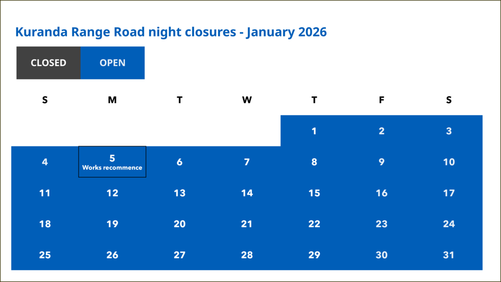 If you need further information about these works, please contact the TMR Cairns office by email at cairns.office@tmr.qld.gov.au, visit the project webpage Kuranda Range Road reconstruction or telephone 1800 187 937.