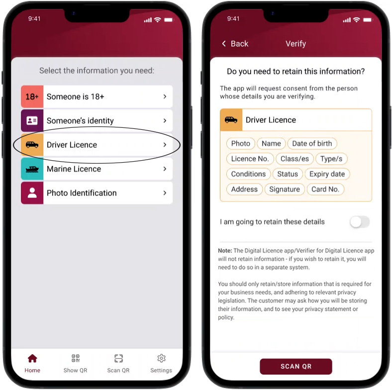 Using the Verifier for Digital Licence app, or Digital Licence app, you (the verifier) will select the information you want verified from your customer. This will change depending on your verification needs.