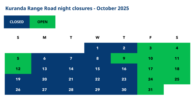 See the schedule for Night Works for Kuranda Range Road - noting the exceptions below.
