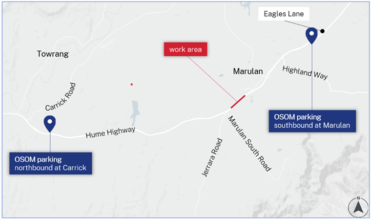 OSOM vehicles wider than 4.5m will need to use the designated pullover areas in both directions on approach to Marulan and call UHF channel 24 to arrange access through the work area.