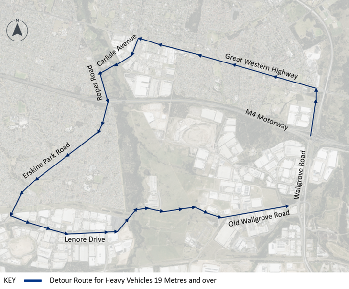 A detour via Wallgrove Road, Great Western Highway, Carlisle Avenue, Roper Road, Erskine Park Road, Lenore Drive and Old Wallgrove Road will be in place for heavy vehicles 19 metres and over while this work is carried out.