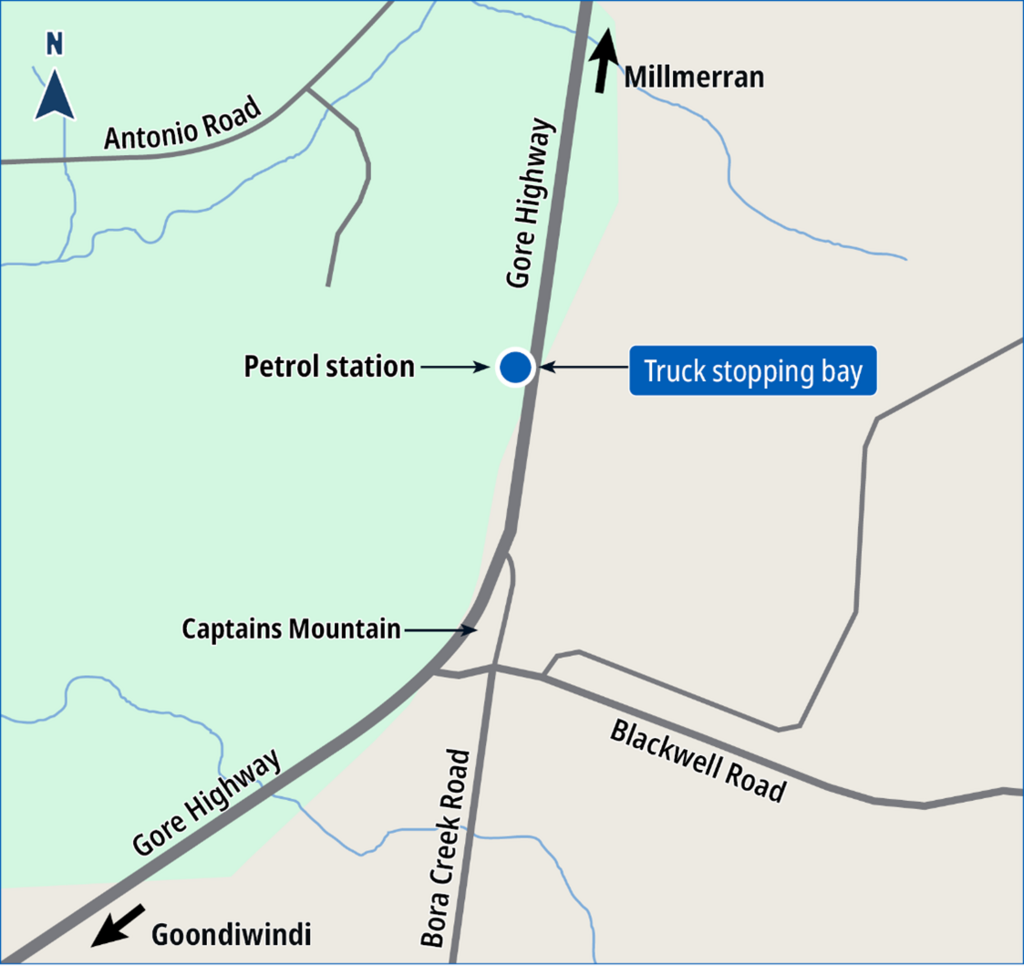 Gore Highway, southwest of Millmerran – southbound truck stop opposite BP Service Station, Captains Mountain (see Figure 1).