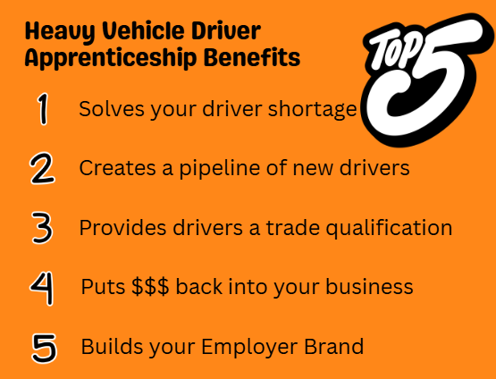 Investing in the apprenticeship attracts incentives like payroll tax concessions, workers’ compensation which saves money that can be reinvested into your business. Having a pipeline of your own drivers also prevents having to constantly outlay all the costs associated with replacing drivers.